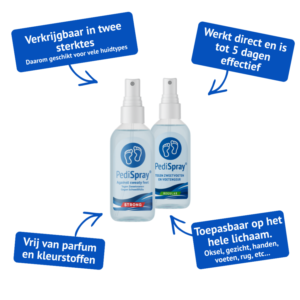 PediSpray® bekämpft das Problem an der Wurzel: beim Schweiß selbst. Durch die Regulierung der Schweißbildung beseitigen Sie direkt die Hauptursache sowohl für den Geruch als auch für den Nährboden für Pilze. Dies macht PediSpray® zu einem überlegenen Mittel gegen Schweißfüße. Durch die Regulierung der Schweißbildung beseitigen Sie direkt die Hauptursache sowohl für den Geruch als auch für den Nährboden für Pilze. Dies macht PediSpray® zu einem überragenden Mittel gegen Schweißfüße.