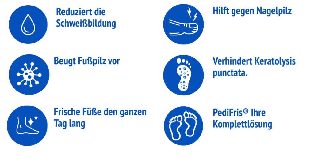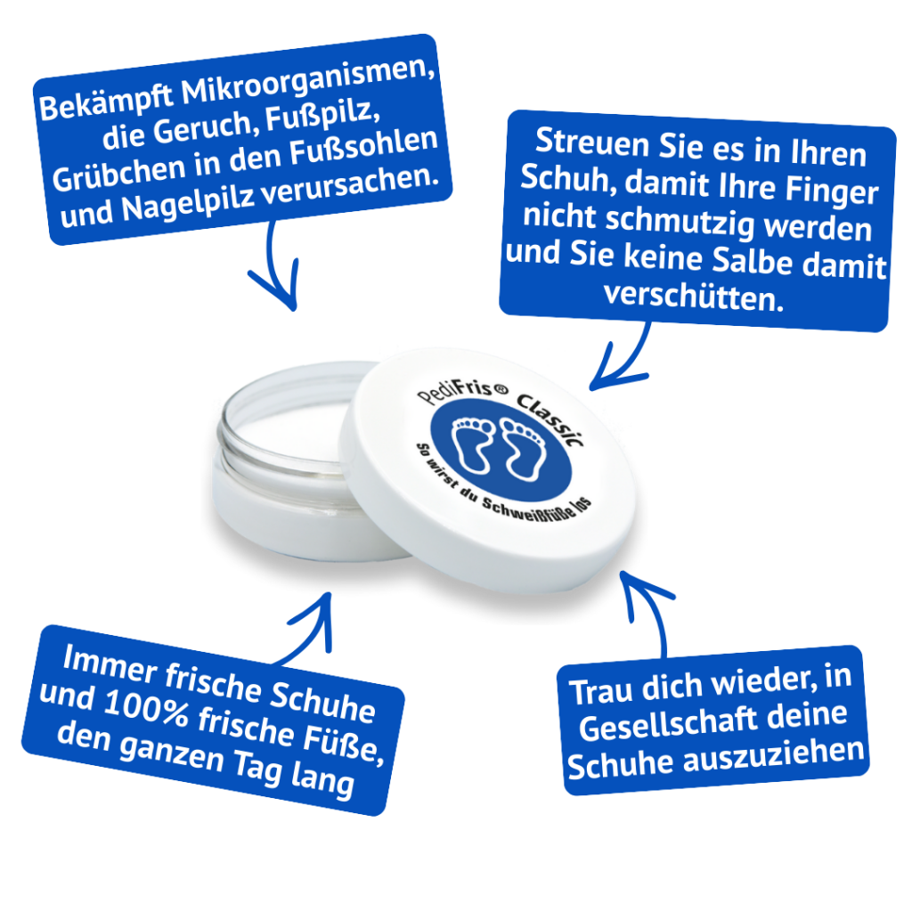 Indem Sie PediFris® Classic in Ihre Schuhe streuen, schaffen Sie eine hygienische Umgebung, die das Wachstum von Mikroorganismen hemmt. Dies sorgt nicht nur für langanhaltend frische Füße und Schuhe, sondern bietet auch einen kraftvollen, kontinuierlichen Schutz gegen Schweißfüße, Stinkfüße, Fußpilz und Kalknägel.